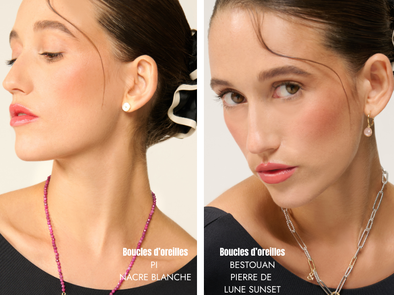 Notre collection de boucles d’oreilles Bestouan rappelant les galets ramassés sur la plage dans notre enfance, apportent de la couleur et de la texture à son look.