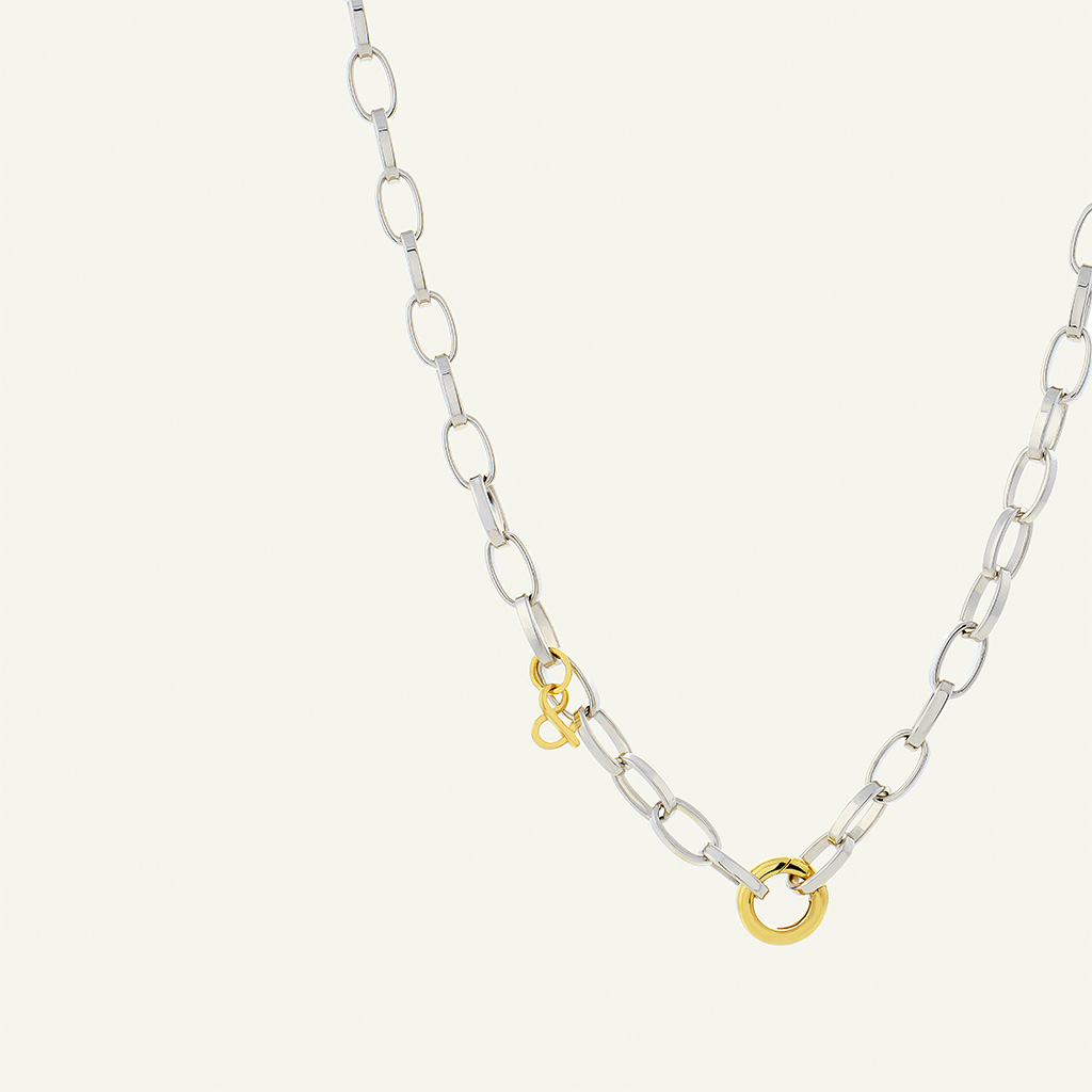La chaîne Dora en or 18 carats recyclé et argent célèbre la douceur et l’équilibre parfait entre l’argent et les accents dorés de l’or 18 carats. Ses maillons ovales et réguliers, délicatement polis, captent la lumière comme les reflets argentés de la mer au pied des calanques de Cassis. Le design fluide et équilibré épouse naturellement les courbes du cou, offrant un éclat discret mais affirmé.