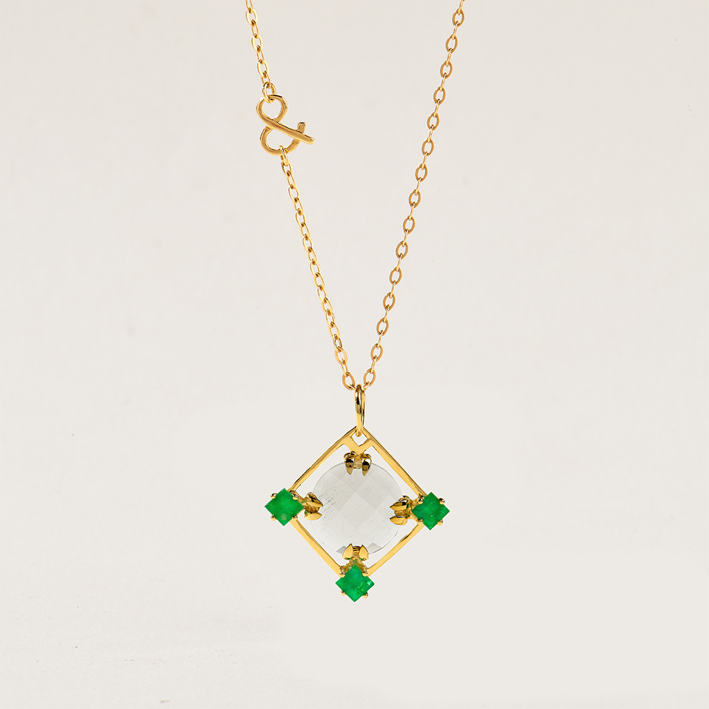 Une femme souveraine, alliant élégance et autorité, cette médaille fusionne le style contemporain et la tradition, avec des pierres précieuses serties en griffes apparentes et un design moderne grâce au cristal de roche transparent.
