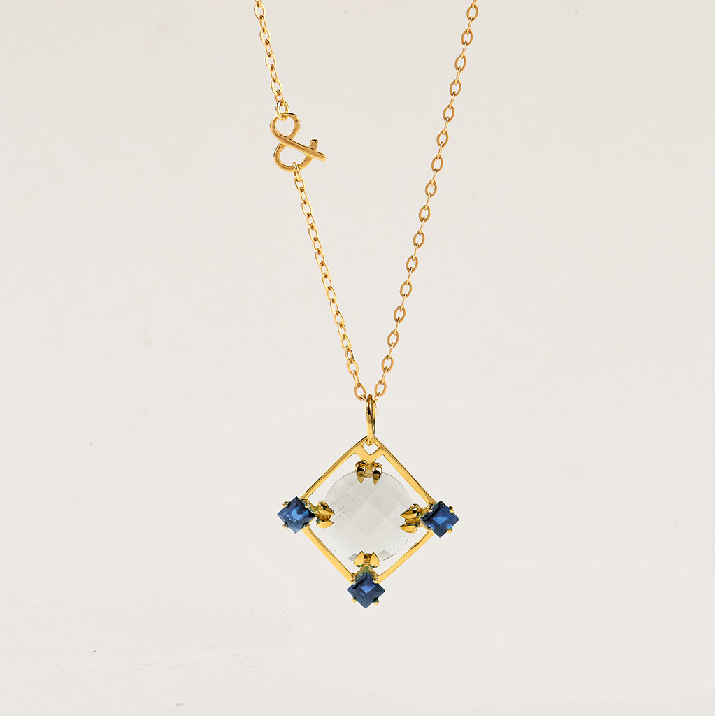 Moderne par sa forme et l’utilisation de la transparence du cristal de roche, elle incarne l’autorité et la sagesse du saphir, symbole de vérité, de clarté mentale et de protection.