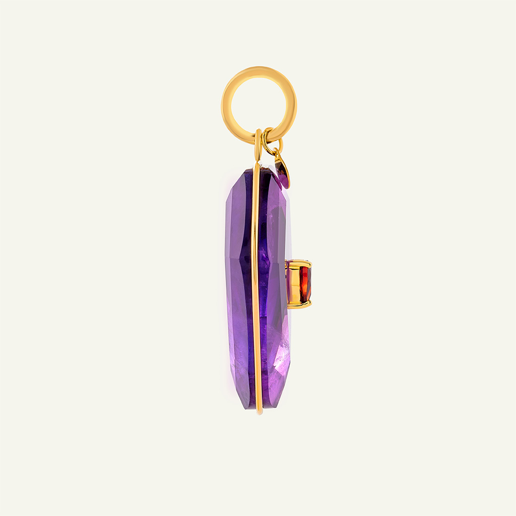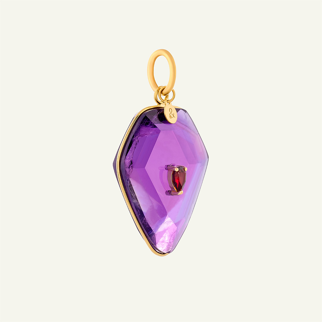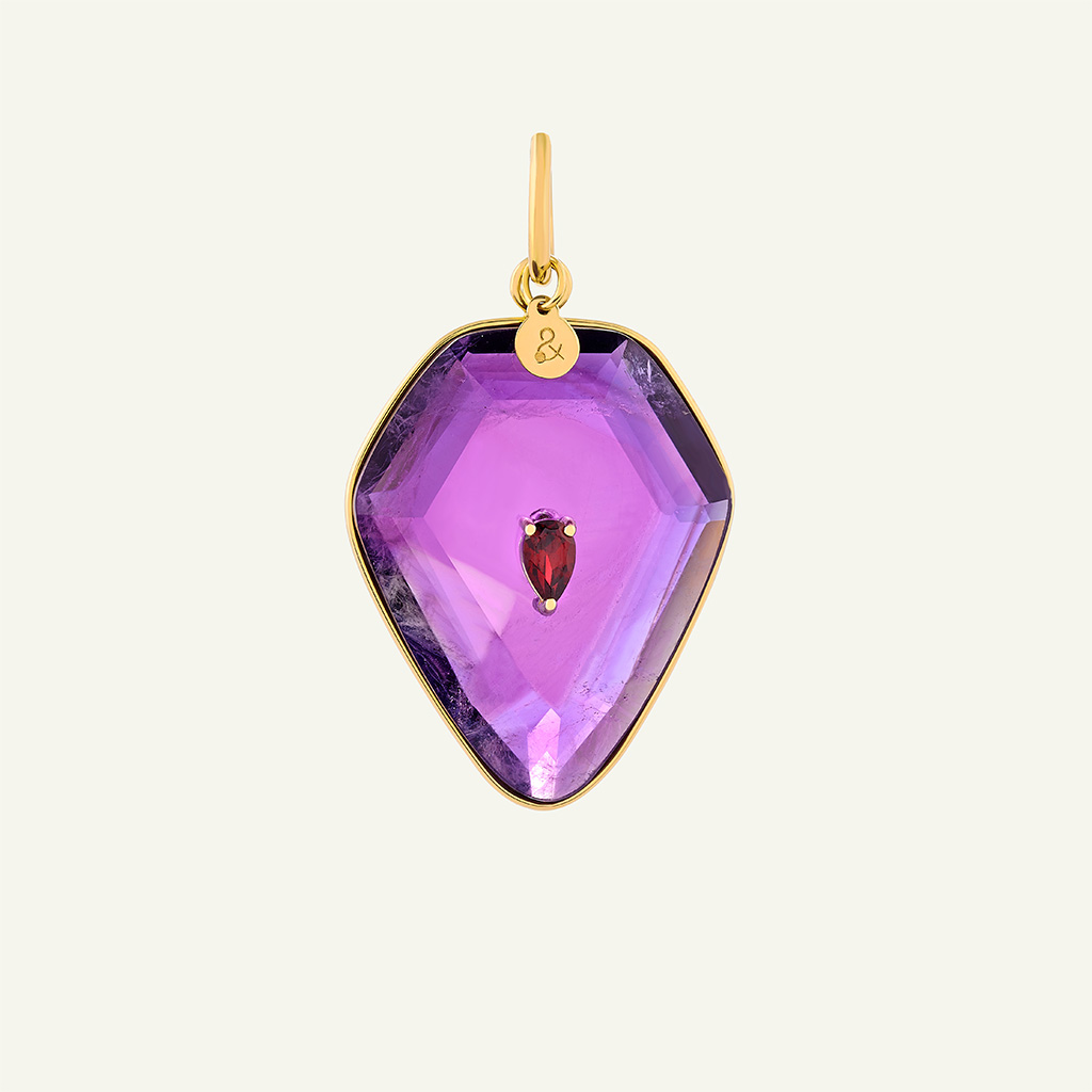 La médaille Calypso en or 18 carats Ecogold et améthyste a été conçue pour être portée seule comme une pièce manifeste ou en accumulation. Sa silhouette imposante, ses courbes fluides et son design sculptural, souligné d’une signature au fil d’or, captent la lumière.