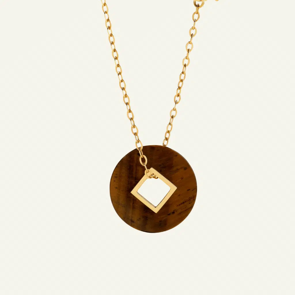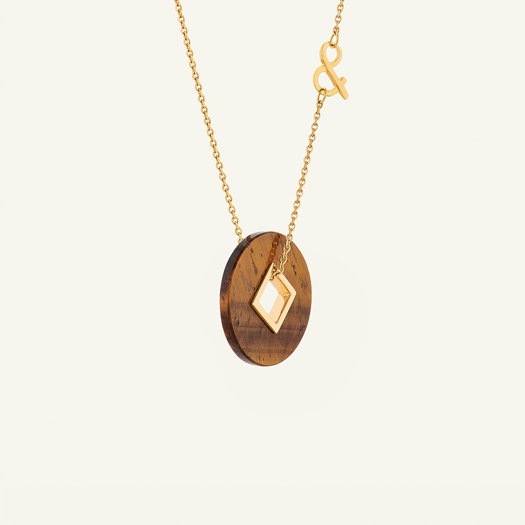 Véritable bouclier énergétique, la médaille PI en œil du tigre et or 18 carats recyclé symbolise la force intérieure et la maîtrise de soi.